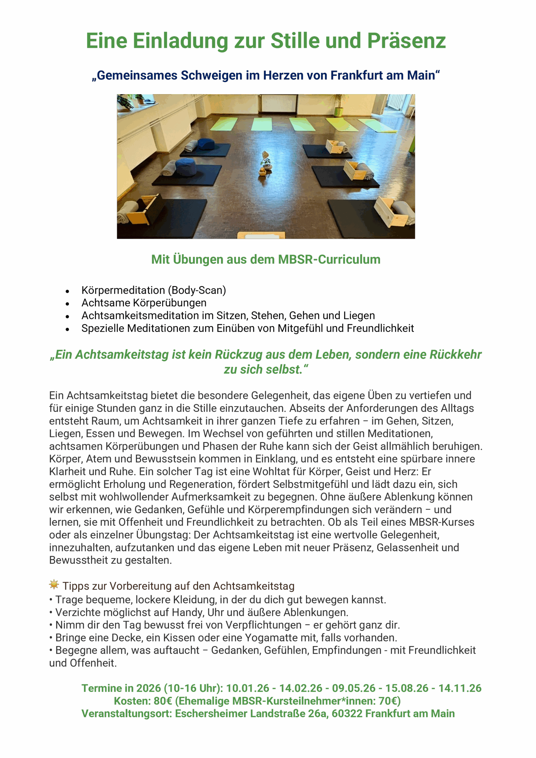 laden dazu ein, den Lärm des Alltags hinter sich zu lassen und in die heilsame Stille einzutauchen – um sich selbst wieder zu begegnen und die eigene Achtsamkeitspraxis zu vertiefen.